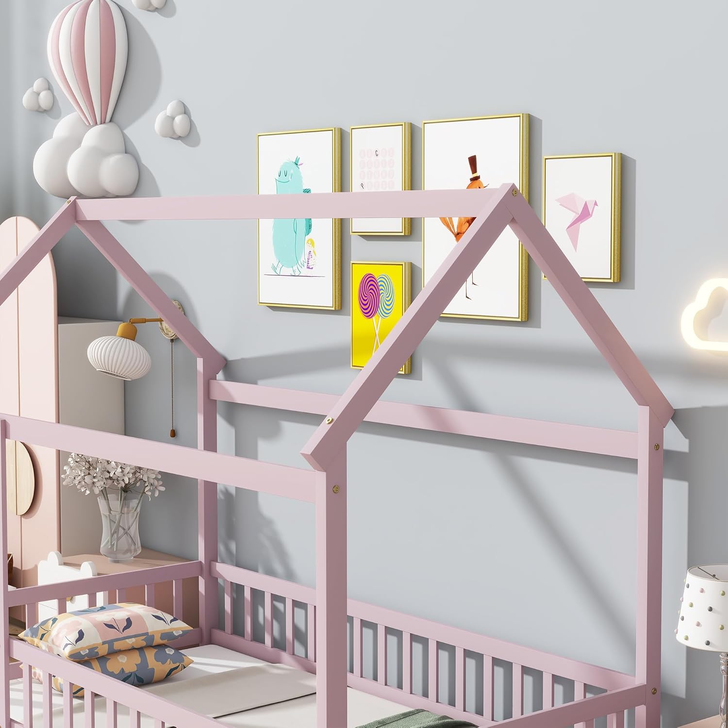 This charming twin-size floor bed features a wooden house-style roof frame and slatted guardrails, creating a cozy, imaginative space for kids. Crafted from durable rubber wood, its low-profile design ensures stability while the open-fence entry allows easy access. The reinforced slatted base supports airflow and comfort, perfect for playtime or rest. Easy to assemble and available in multiple finishes, this Montessori-inspired bed blends functionality with playful style
